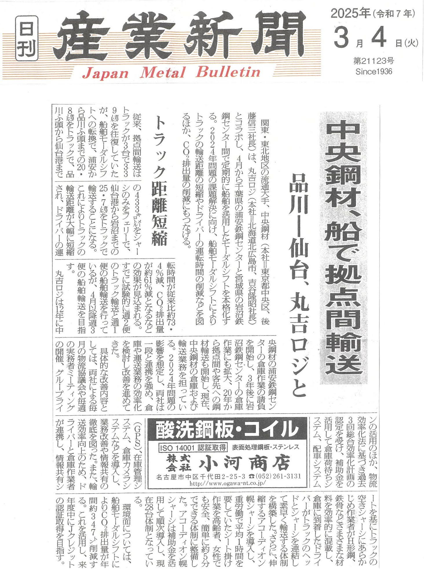中央鋼材、船で拠点間輸送 品川ー仙台、丸吉ロジと トラック距離短縮